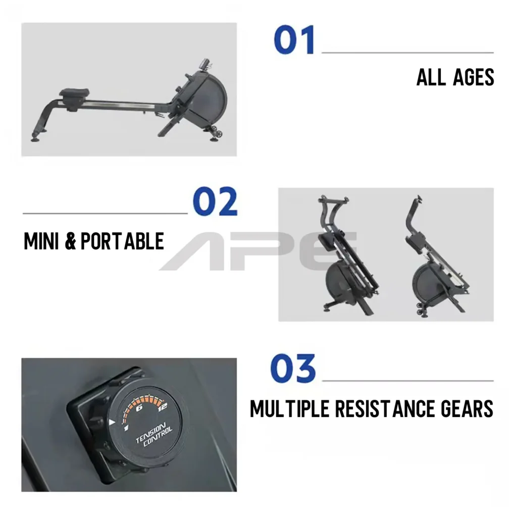 MAGNETIC ROWERSSPECIFICATIONS & FEATURES:Product Dimension: 1850x510x735mm;N.W/G.W: 37/43kg;Max User Weight: 150kg;Source of Resistance: Magnetic;High defination LED display, wider visual angle, more comfortable, zero radiation, no harm to eyes, accurate data display;Exercise Body Parts: Lower body muscles, core muscles, upper body muscles, abdominal muscles;Display Information: Time, speed, mileage, calorie. YOU MIGHT ALSO LIKE SMITH MACHINE AP500APE FITNESS AIR ROWER ProAPE FITNESS LEG EXTENSION & CURLAPE FITNESS SKI-ERG ProAPE FITNESS